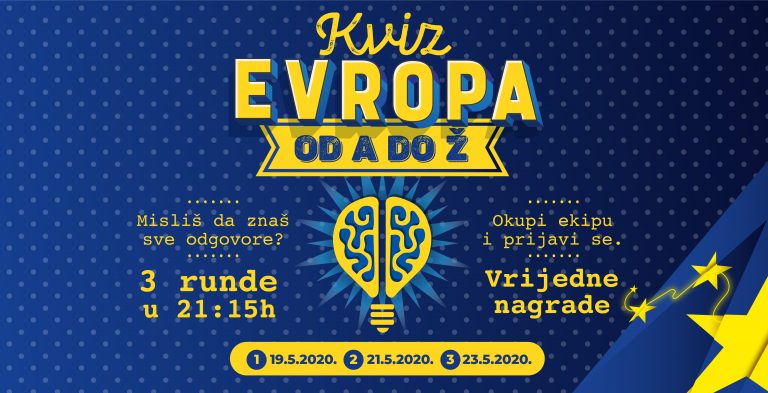 Svi vi koji sa svojih kauča znate tačne odgovore na pitanja iz kvizova, došlo je vaših pet minuta! Nema boljeg načina da se zabavite nego da iz svoje sobe i s timom koji vi odaberete provjerite svoje znanje o Evropskoj uniji i osvojite vrijedne nagrade.
