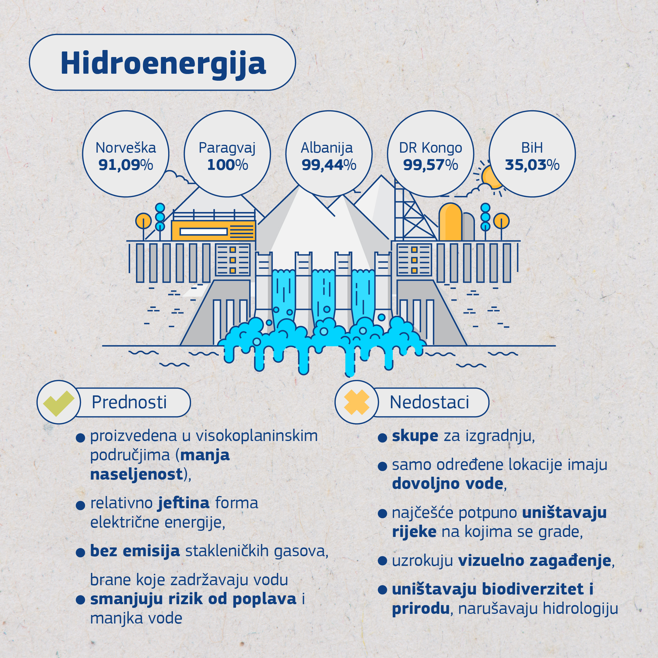 U globalnoj proizvodnji i potrošnji električne energije, hidroenergija prednjači u odnosu na ostale obnovljive izvore. Iako je manji procentualni udio u ukupnoj količini energije koja se dobija iz ovih izvora pojedine države se gotovo u potpunosti oslanjaju na hidroenergiju. Norveška 91,09%, Paragvaj 100%, Albanija 99,44%, DR Kongo 99,57% i druge dok je u BIH 35,03%. Pored toga što je ovo obnovljivi izvor energije, prednosti su da je proizvedena u visokoplaninskim područjima sa manjom gustinom naseljenosti, relativno jeftina forma električne energije i nema emisije stakleničkih gasova. Brane se grade da zadržavaju vodu, smanjuju rizik od poplava i manjka vode. Postoje i nedostaci koji se ogledaju u tome da su veoma skupe za izgradnju, samo određena mjesta imaju dovoljno vode, najčešće potpuno devastiraju rijeke na kojima se grade, uzrokuju vizuelno zagađenje, uništavaju biološku raznolikost i prirodu općenito, jer njihovom izgradnjom nestaju mnoga vrijedna staništa i vrste, imaju negativan uticaj na ribe, jer zbog njih nestaju mrjestilišta, remete hidrologiju i uzrokuju promjene u nivou podzemnih voda. Takođe, uvijek postoji mogućnost za njihov kolaps. Mulj koji je prije potopa pokrivao poljoprivredno zemljište, taloži se na dnu jezera, a pokazalo se i da vegetacija koja je poplavljena i u fazi je raspada, može emitovati metan I karbon dioksid, dva staklenička plina.