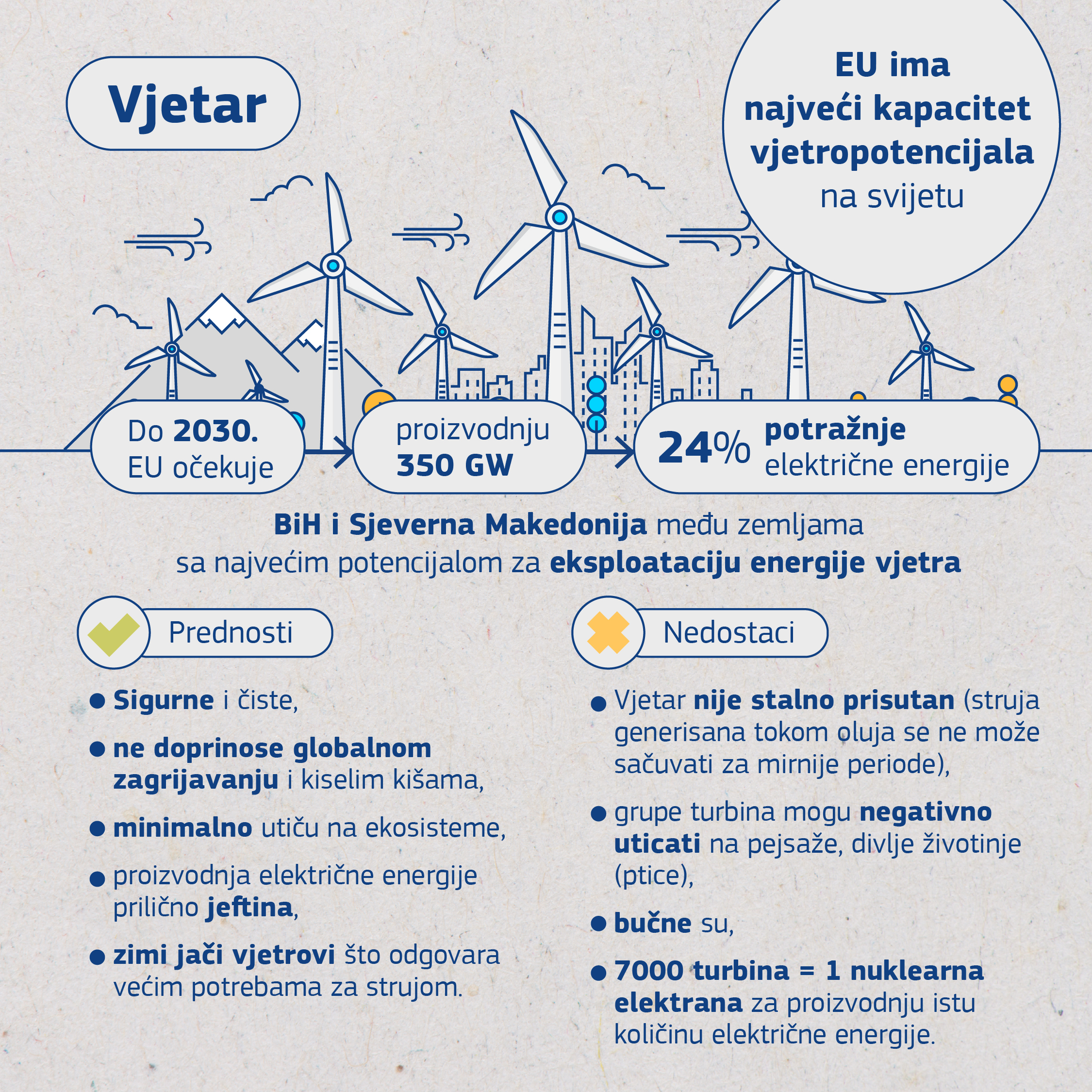 Vjetar je još jedan obnovljivi izvor energije, a kako pokazuju zvanični dokumenti EU-a, ova unija ima najveći kapacitet kada je riječ o vjetropotencijalu na svijetu i očekuje se da će se u EU proizvoditi 350 gigavata (GW) do 2030. godine što je 24 posto potražnje za električnom energijom.