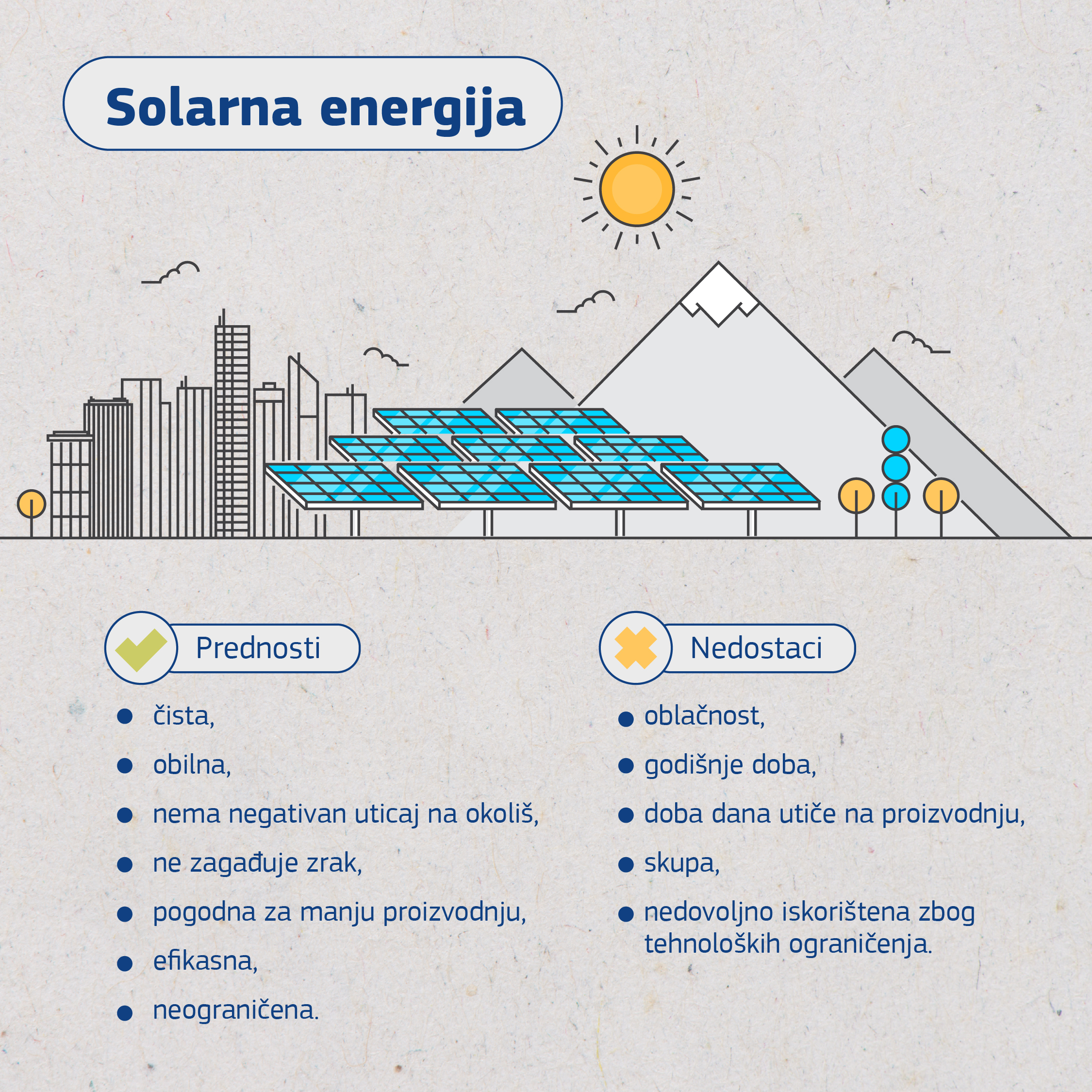 Još jedan obnovljiv izvor energije je solarna energija. Energija sunca je čista I toliko obilna da je količina energije koju zemlja primi za 30 minuta jednaka svoj snazi koju ljudi koriste u jednoj godini.
